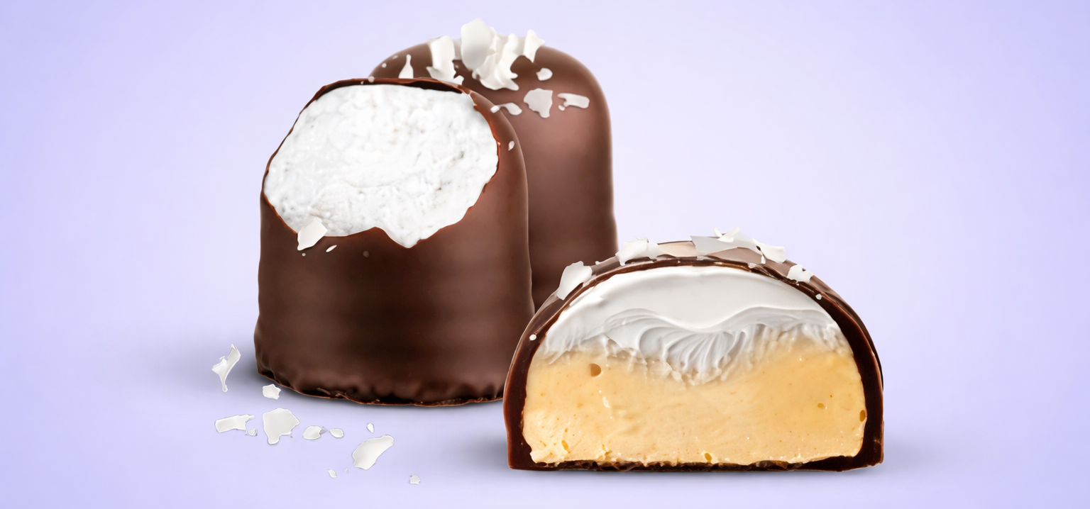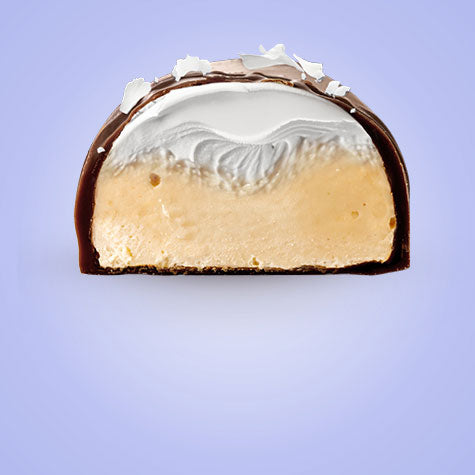 Fluffy vanilla cream and soft protein dough, surrounded with crisp dark chocolate, sprinkled with delicate coconut flakes.